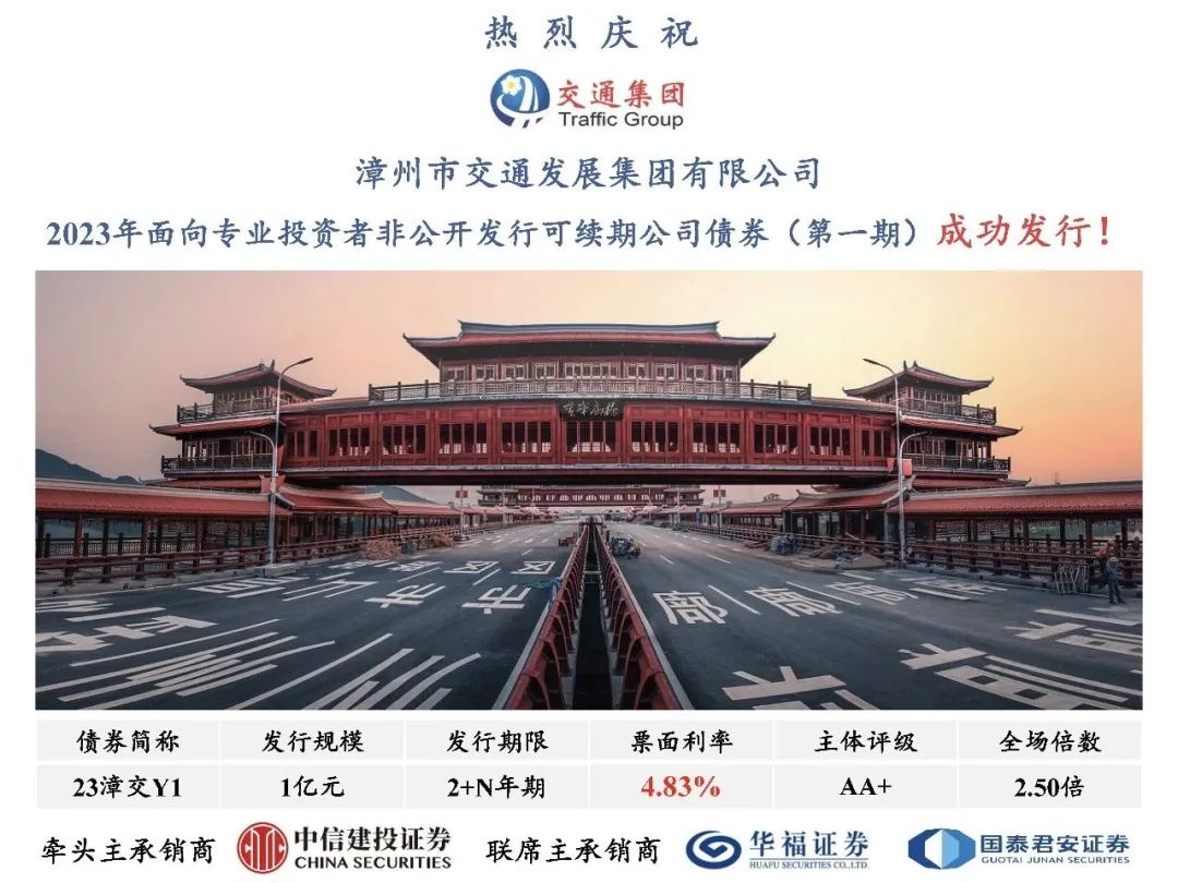 2月27日,漳州市交通發展集團有限公司2023年面向專業投資者非公開發行可續期公司債券(第一期)簿記發行,由中信建投證券擔任牽頭主承銷商,華福證券和國泰君安證券擔任聯席主承銷商,發行規模1億元,期限2+N年期,票面利率4.83%,全場認購倍數2.50倍。