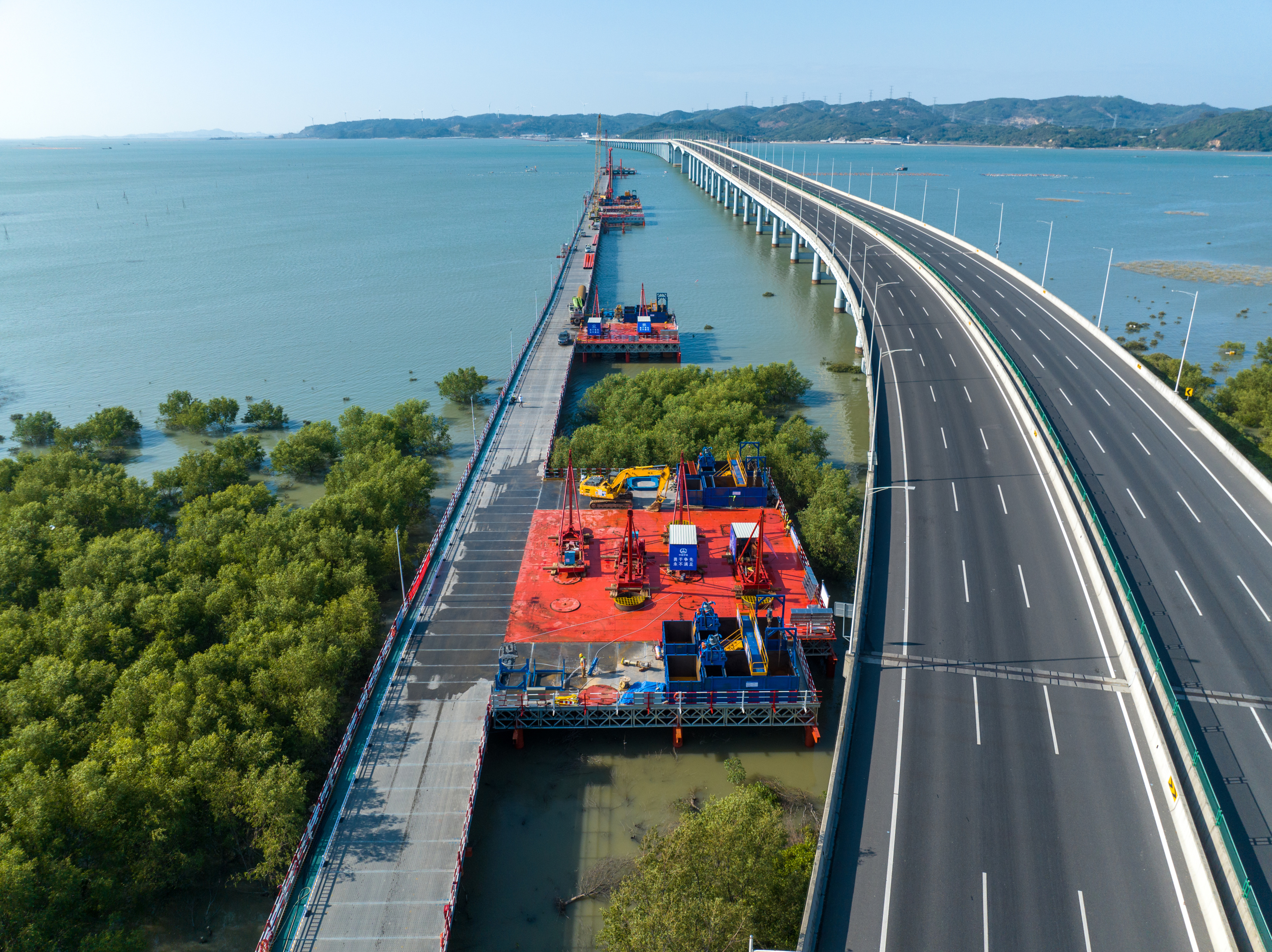 在各方的共同努力下,漳汕高鐵(福建段)3標全線已累計完成樁基975根,承臺88個,墩身71個,海上鋼棧橋完成3168米,隧道正在進行進洞施工前的準備工作。